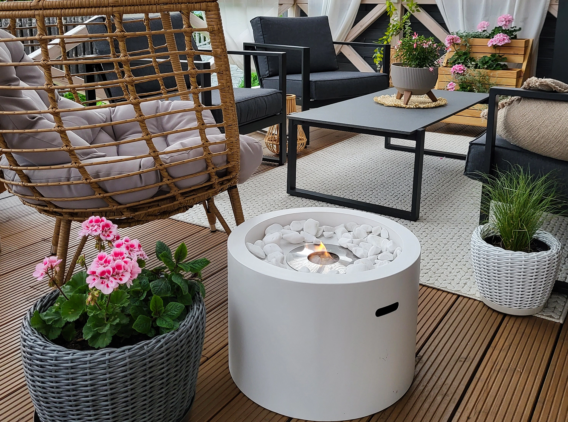 Med denne fritstående biopejs i hvid mat får du friheden til at skabe hygge og varme overalt i stuen, på altanen, i haven eller på terrassen. Uanset hvor du placerer den, får du ægte flammer, elegant design og e